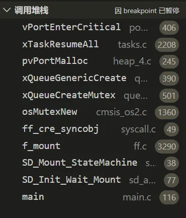 此时查看调用堆栈可知,挂载SD用的f_mont会调用一系列函数来创建互斥量,最终调用vPortEnterCritical进入临界区。