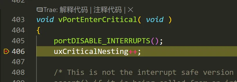 但这依然没有解决我的疑惑,因为这些代码是 CubeMX 生成的,肯定不会出现忘记退出这种操作。随后我又在临界区相关的两个函数(vPortRaiseBASEPRI和vPortSetBASEPRI)里设置断点,发现它们压根就没被调用过。