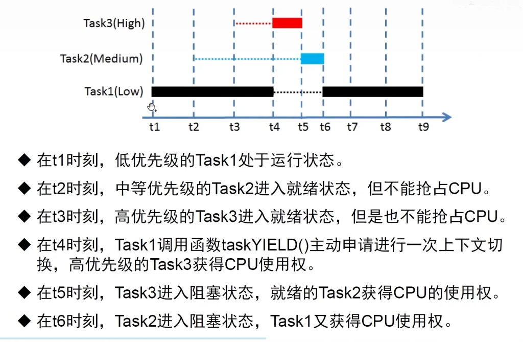- t3时刻:即使是最高优先级的 Task3 进入了就绪状态(对应红色的水平虚线),它同样不能抢占 CPU。此时系统中有两个更高优先级的任务在“排队”等待。