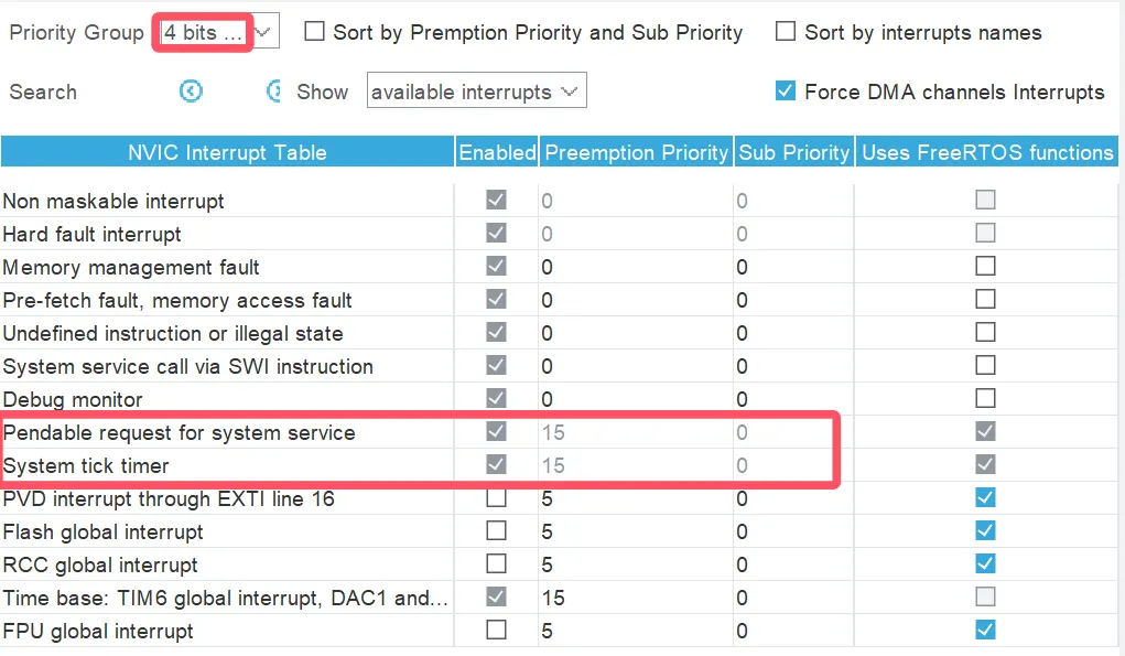 在 cube mx 里可以看到,系统滴答定时器中断和挂起中断的优先级都被设置为了 15,说明 freertos 的任务优先级总是低于系统中断优先级。